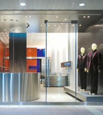 The dark wood of the display and storage wall warms the main space and the effect is repeated in the back lounge, where a black Le Corbusier couch sits on a raised mahogany floor. The low ceiling of the lounge creates an intimate space, a contrast to an initial impression of spaciousness within the shop. The lounge is intended to evoke the comfort of an old world-style men's club. The interplay of compressed and open spaces is even evident within the lounge. Adjacent fitting rooms are enclosed with chromogenic glass and when the fitting room doors are closed, the glass is opaque and can double as a film and video screen. When the doors are open, however, the glass becomes clear and expands the space visually. Subdued shades of red and blue add more warmth to the shop.